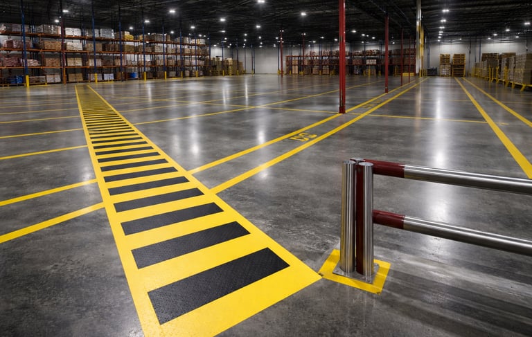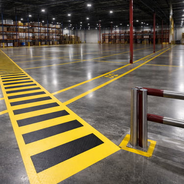 Organized, high-durability floor markings designed to improve safety, workflow, and efficiency in industrial spaces. Ideal for walkways, loading zones, and storage areas.